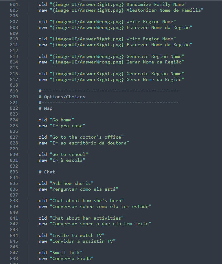 ✨ Do not change texts that are within {} and [], as they are codes and variables (like character names) and any change may cause errors in the game and leave your translation unfeasible.